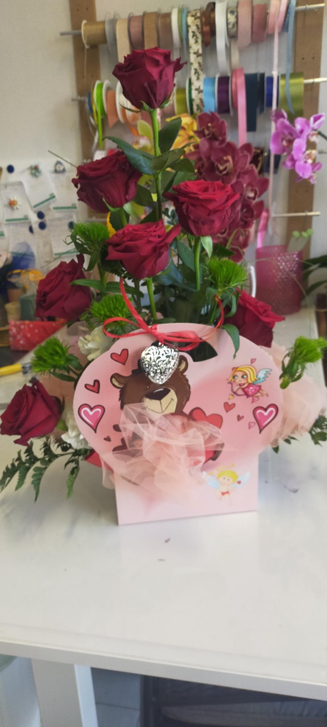 Confezione reciso San Valentino con 5 rose rosse e cuore barocco in metallo